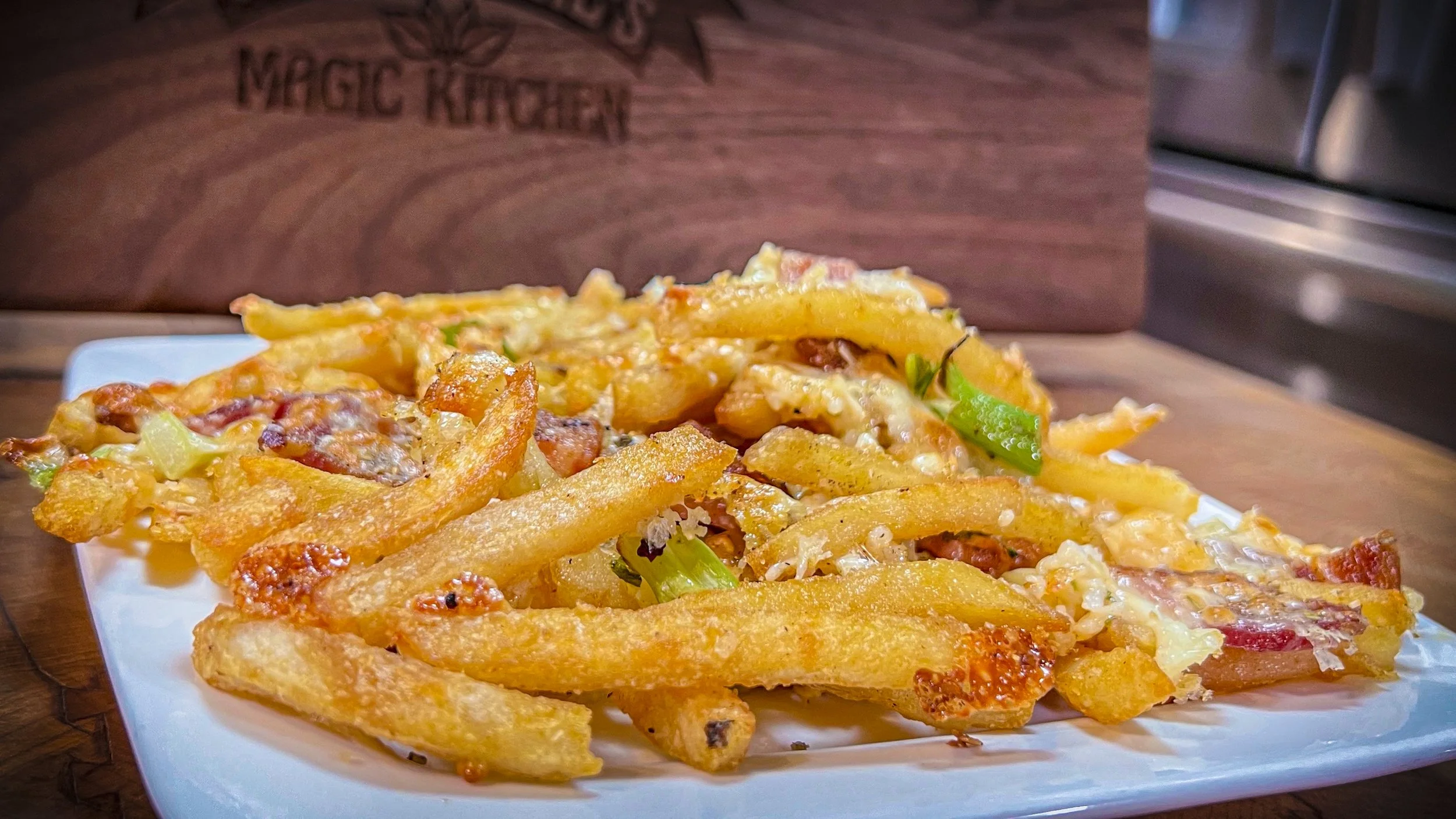 Do you know how some people love French fries? Utterly obsessed with eating them all the time, might be the only vegetable-consumed kind of French fry love? When my teens were tiddlypeeps, they ate them just about every other day. They still love them, but if they're topped with another culinary fave like Pizza, chili, cheese, nacho or seafood, fuhgetaboutit! Next-level love. These are so easy, and you know this mama loves easy. Work smarter, not harder is my current motto and mantra. This is a great "snack" meal, which the kids love! It can also be a side or party platter. Versatility is desirable, doncha think? Have fun with the toppings.